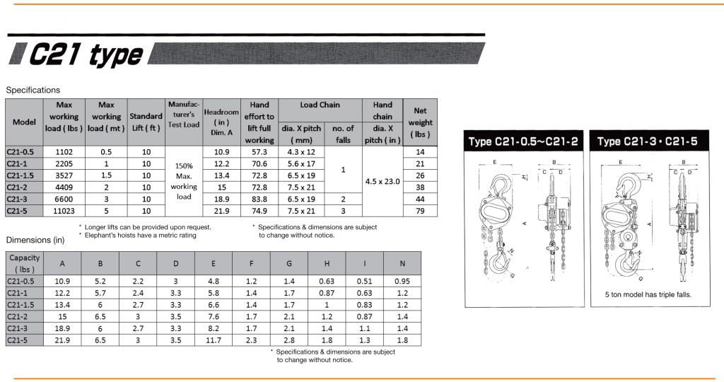 - Lightweight lifting capacity ratio, a 1 ton unit with 10’ lift weighs 20% less than other Japanese hoists