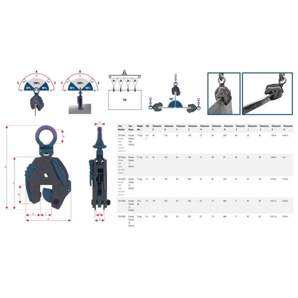 • The hinged hoisting eye allows for the clamp to place and lift the load from any direction, or with a multiple leg sling without side loading the clamp.