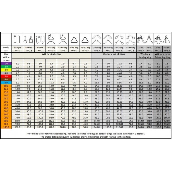 A 60 degree 2 leg sling example: If the weight of the load to be lifted is 20 tonnes and the angle between the legs of a two-legged sling is 60 degrees. This means that the load factor is 1.7 for the angle.