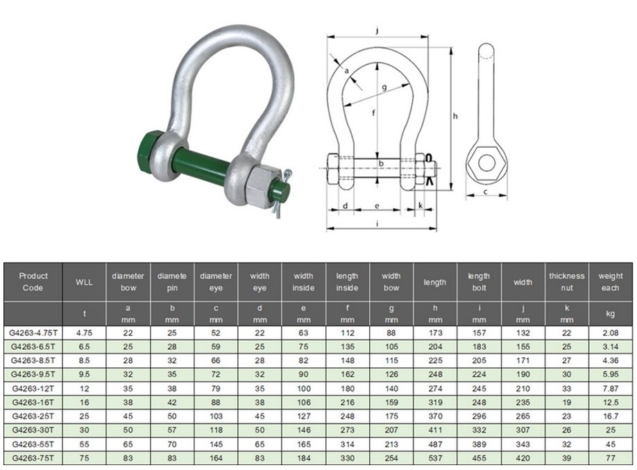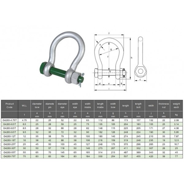 Size / Rating : 4.75T WLL - 25mm Pin - 63mm IW 6.50T WLL - 28mm Pin - 75mm IW 8.50T WLL - 32mm Pin - 82mm IW 9.50T WLL - 35mm Pin - 90mm IW 12.0T WLL - 38mm Pin - 100mm IW