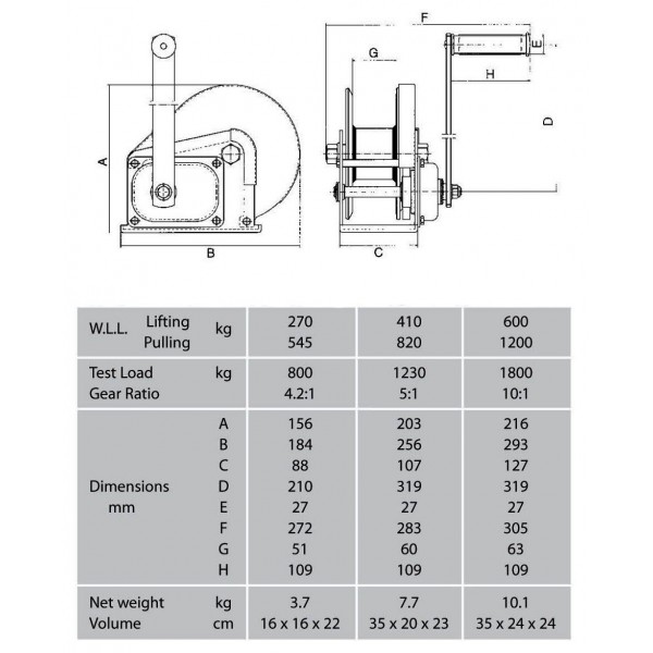 270Kg Lift Winch 4.2:1 Recommend Max 4mm Dia x 30m 7X19 IWRC Wire Rope