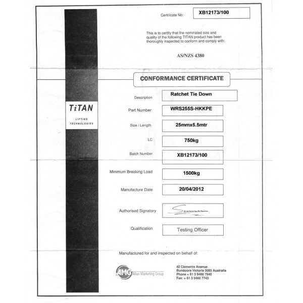 These TiTAN Tie Downs EXCEED the minimum 2:1 Safety Factor required on all components used to manufacture this item under New Zealand Standards.